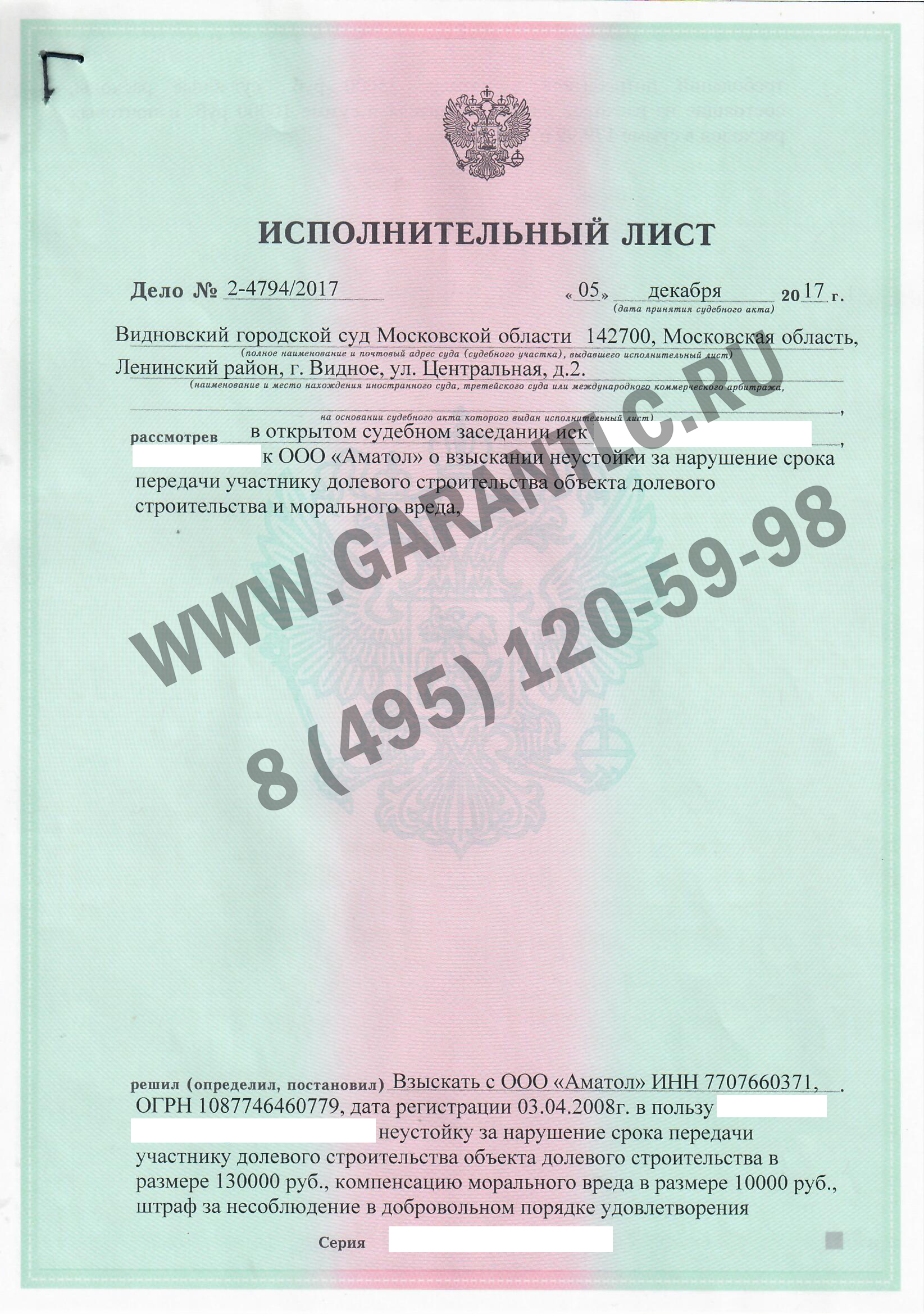 Практика ЮК ГАРАНТ по взысканию неустойки в ЖК Южное Видное